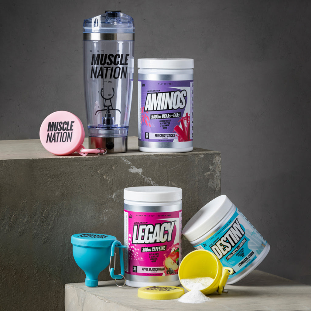 And of course, no collection is complete without some essential accessories and new supplements. Our electric shaker is back by popular demand with a super convenient USB charger. Also available are the Fill and Go Funnel 3 pack and new flavours in our best-selling Destiny Fat Burner, Legacy Pre-Workout and Aminos Bcaa's + Eaa's.