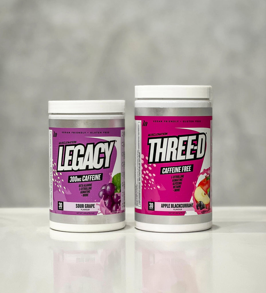 Introducing our two brand new supplements for this winter- Apple Blackcurrant Three-D Pre workout and Legacy Sour Grape Pre-Workout. Our Three-D pre workout gives you the pump and energy you need in the gym, without the shakes and anxiety. Our delicious new apple and blackcurrant flavour will have you pumped and ready before your workout and putting in the work each set. Our Legacy pre-workout is a customer favourite, with 300mg of caffeine per serve, Beta Alanine, L-Citrulline, Agmatine and much more, its a great choice for that extra energy.