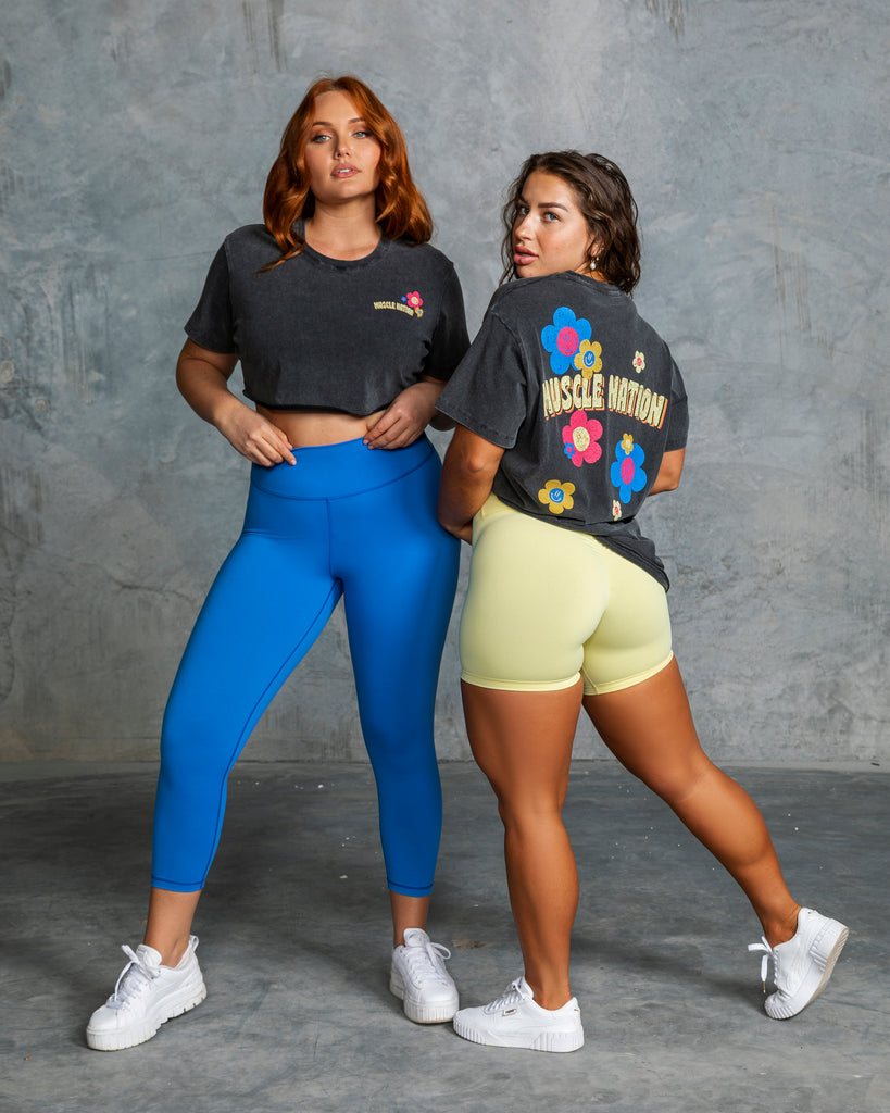 Bringing back the styles you love, and the comfort you deserve in the gym are Muscle Nations signature scrunch bike shorts and ⅞ leggings but with brand new, bright colours. A new season doesn’t mean compromising on style, so with these new bright blue and yellow designs, you can stand out in the gym and still get your pump on in the same comfortable and breathable material as always. Crafted from Muscle Nations signature scrunch fabric, high waistband and figure hugging design, you can get to work doing any workout in the gym in style.