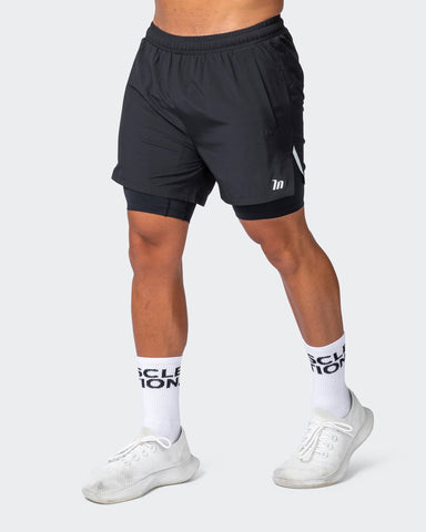 MAX DISTANCE SHORTS - The ideal lined men’s short for running and gym training. These two-in-one shorts are lightweight, sit above the knee and have longer built-in internal shorts providing support. Additionally, they include reflective taping and a mesh phone pocket on the right leg of the internal shorts. This secures your phone, making them a great running short for men.