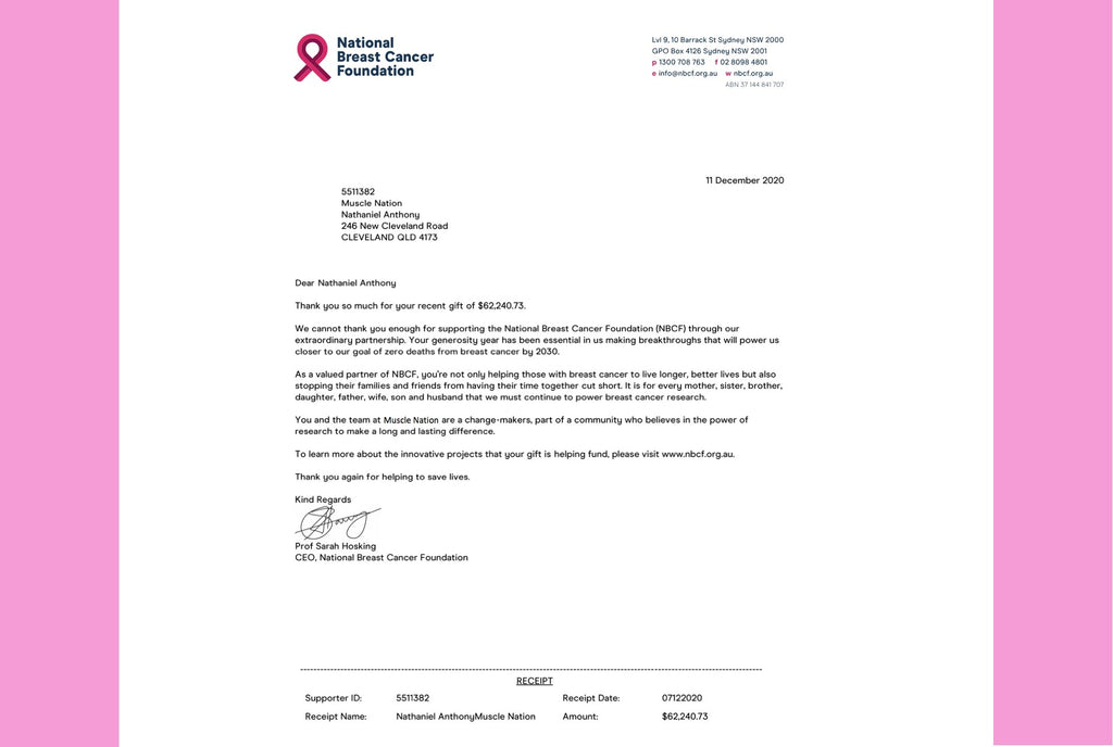 On October 26, 2020 we proudly released our Muscle Nation Breast Cancer Awareness Tees for Women and Men. Full proceeds of sales were donated to the NBCF - not just the profit or a portion, but the full amount of every tee sold was donated.
