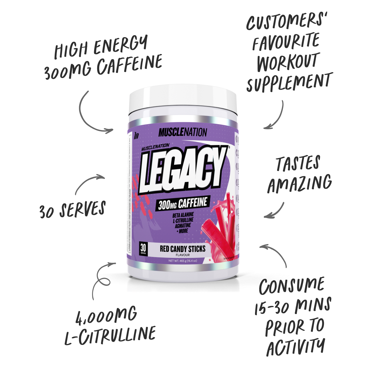 When you're looking for a push, Legacy Pre-Workout is our customers favourite. With 300mg of caffeine per serve, Beta Alanine, L-Citrulline, Agmatine and much more, all you need is 1 scoop for a supercharged session.