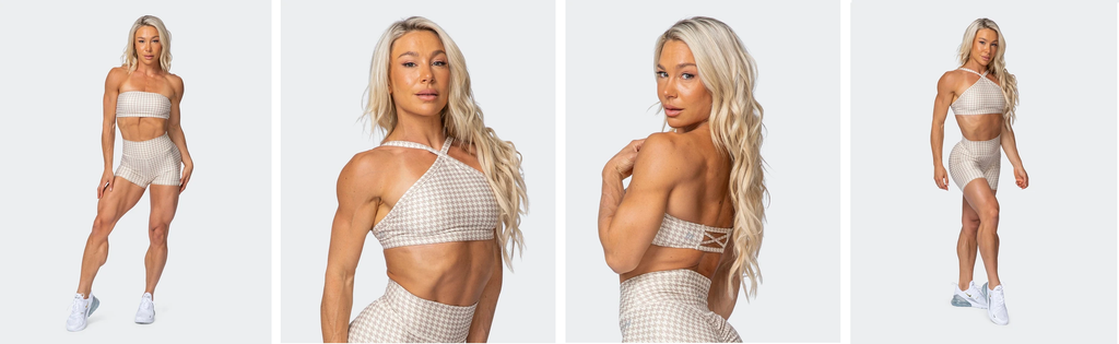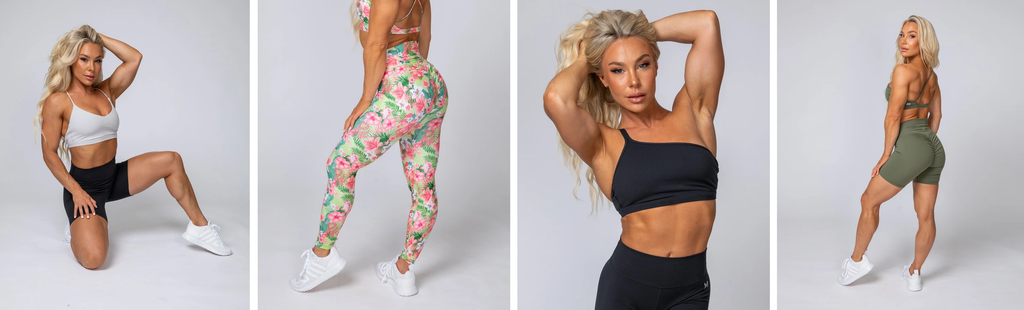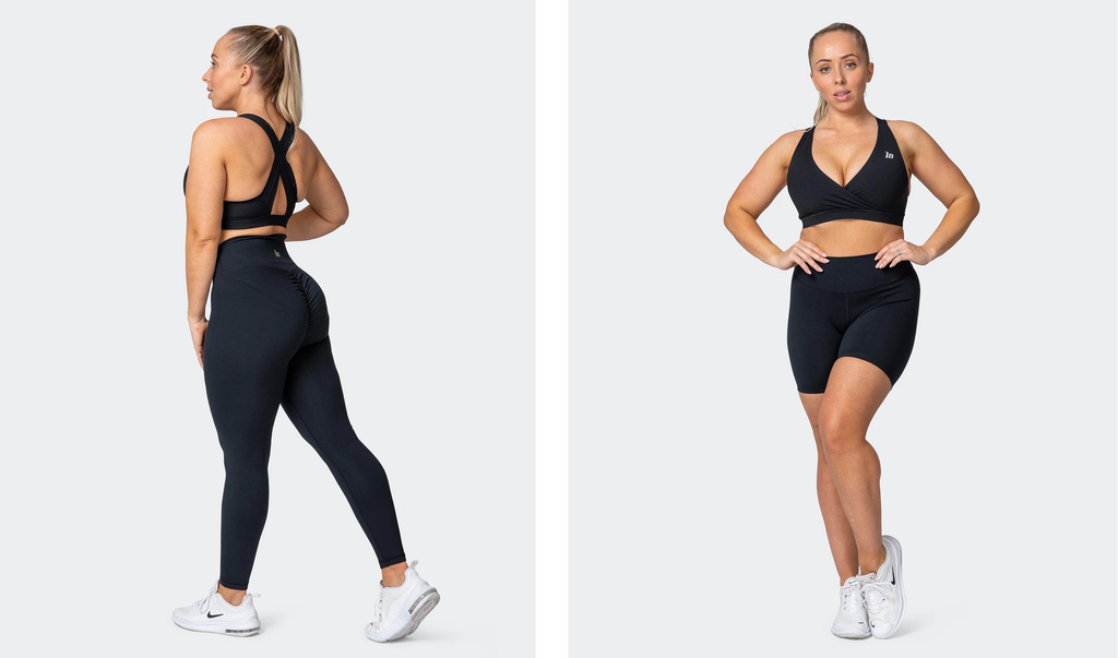 The Leggings and Bike Shorts in this collection are crafted from 75% Recycled Polyester, along with the main fabric of the Bralettes. In addition, the Cropped Mesh Tanks in this collection are crafted from 85% Recycled Polyamide.