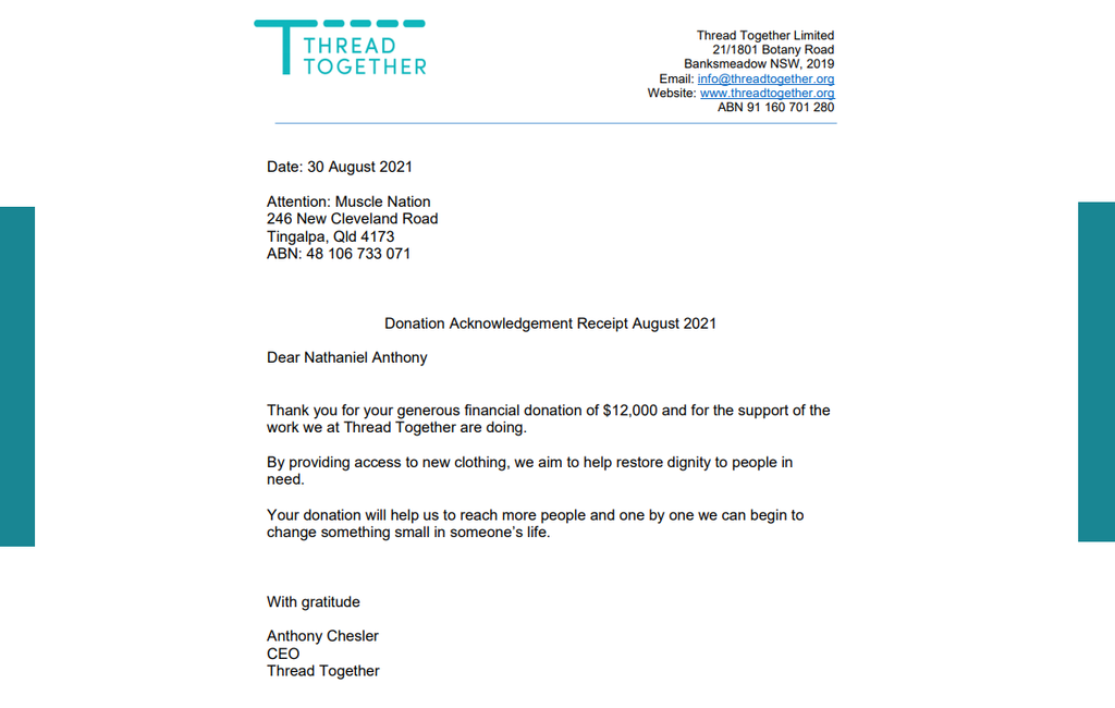Unfortunately, some of our imperfect clothing cannot be redistributed or donated to those in need, as this stock is faulty. We plan to repurpose this faulty clothing by recycling to reduce our environmental impact. With Thread Together, we are organising for this stock to be collected from our Muscle Nation Warehouse and recycled, to combat this clothing going straight into landfill.