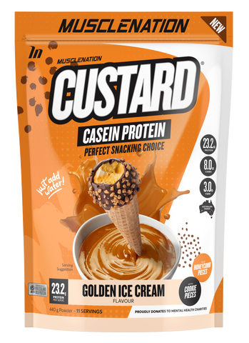 Our ever popular Golden Ice Cream Custard Casein Protein will now be available in a 11 serve pouch. With cookie pieces as well as honeycomb inclusions, this protein treat is the perfect size.