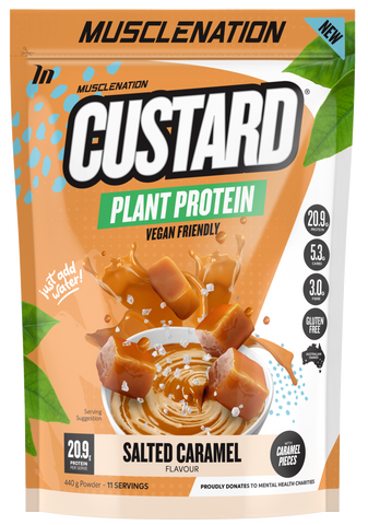Our Salted Caramel Custard Plant Protein Powder, with caramel pieces now comes in an 11 serve pouch. This Custard Plant Protein is the perfect vegan friendly, dairy free and gluten free protein snack.
