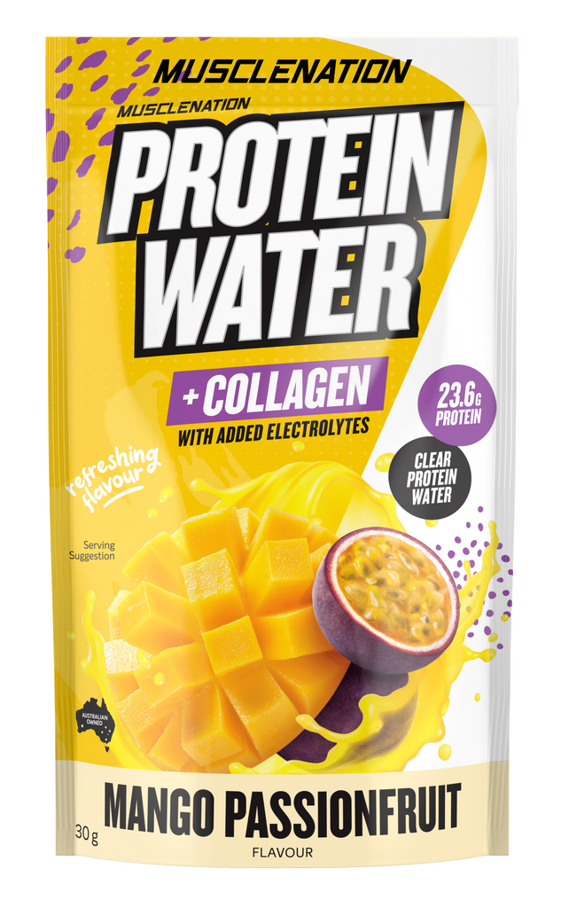 Our new mango passionfruit flavoured clear Protein Water is now available in a convenient single serve sachet. A refreshing drink with 23.6g of protein per serve and with the added benefits of collagen and electrolytes. If you are on the go, our single serve Protein Water is a versatile drink with a refreshing taste.