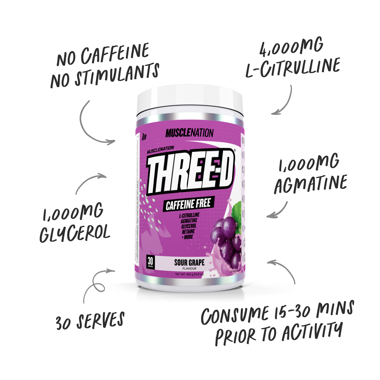 If you are sensitive to caffeine but still want all the benefits of a pre-workout (minus the caffeine), then Three-D is for you. Three-D is packed with all the goodies like Citrulline, Glycerol, Agmatine and more.