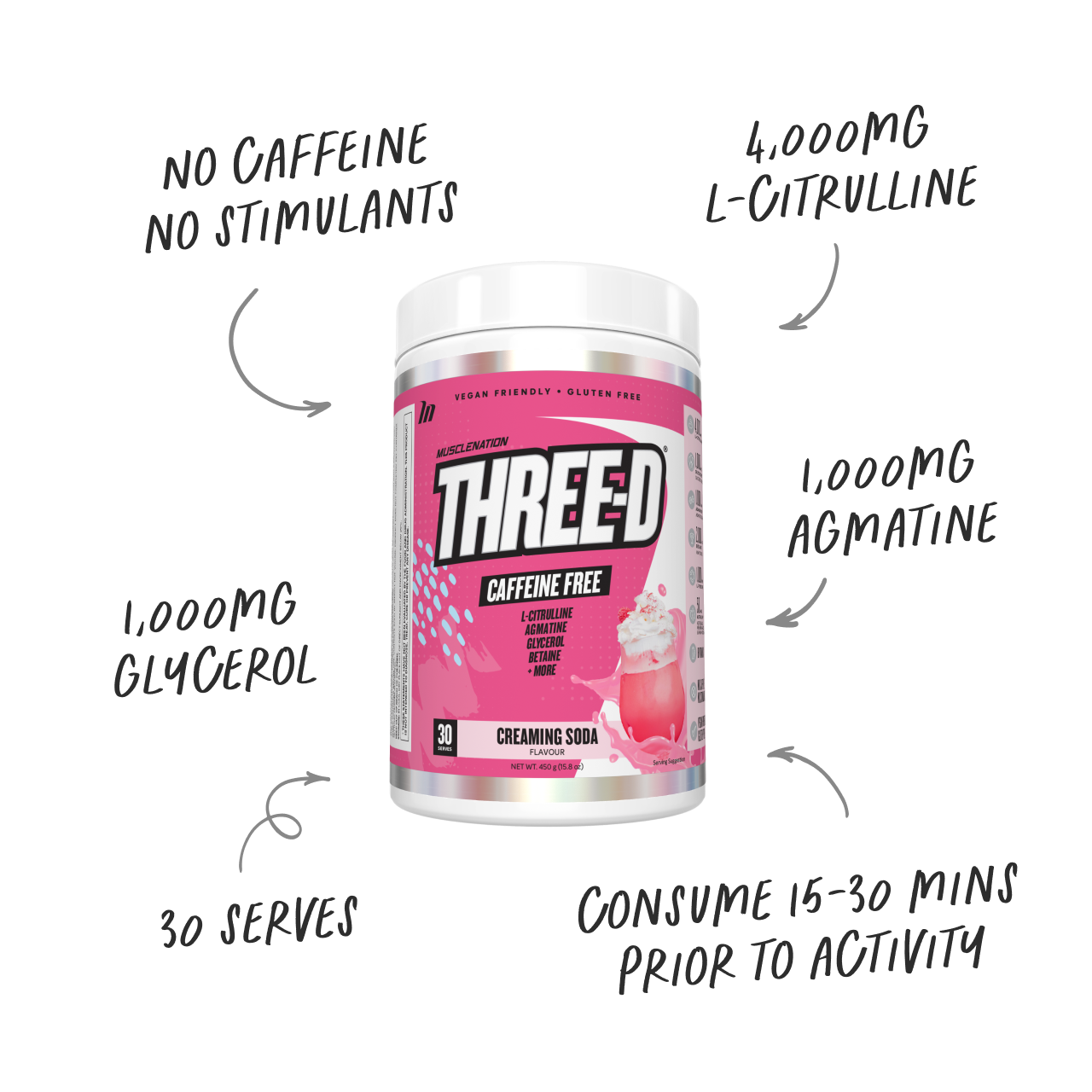 Three-D is our caffeine free pre-workout for anyone who wants that extra push and pump, but without the jitters and anxiety.
